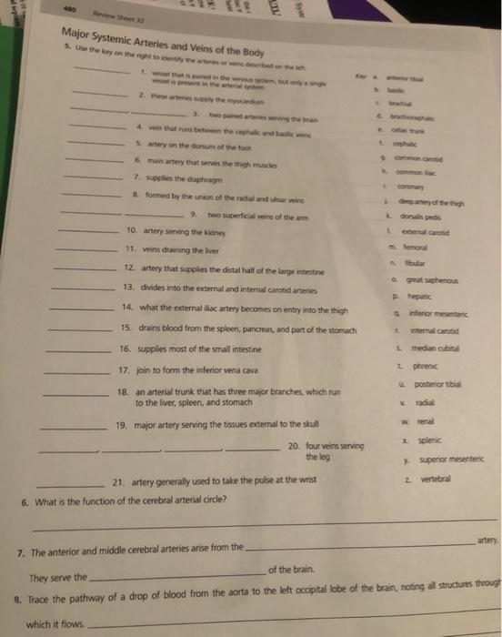 Solved 28. Major Systemic Arteries and Veins of the Body Use - Chegg major systemic arteries and veins of the body use the key on the right to identify the arteries or veins described on the lett k a nterior tibial h basilic vessel that is paired in the venous system, but only a single vessel is present in the arterial system 2. these arteries supply the myocardium _ 3. two paired arteries serving the brain c. …