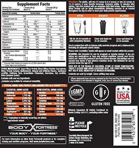 PDF Body Fortress Super Advanced Whey Protein New Formula Label Body Fortress® Super Advanced Whey Protein is aspartame free. Gluten Free Directions: For adults, add one (1) to three (3) scoops (33 g - 100 g) to 12-16 ounces of water or your favorite beverage daily. Consume within 10 minutes after mixing. Take this product with an adequate daily fluid intake.