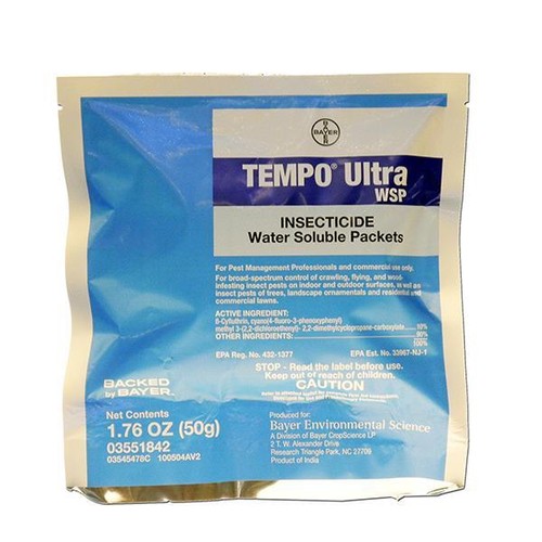 Tempo Ultra WSP Insecticide - Solutions Pest & Lawn Tempo Ultra WSP is a powerful broad label insecticide manufactured by Bayer and is designed to control a broad range of insects found in various indoor or outdoor areas. Each Tempo Ultra WSP package comes with an individual no mess, pre-measured packet that dissolves in water can make up to 25 gallons of insecticide.