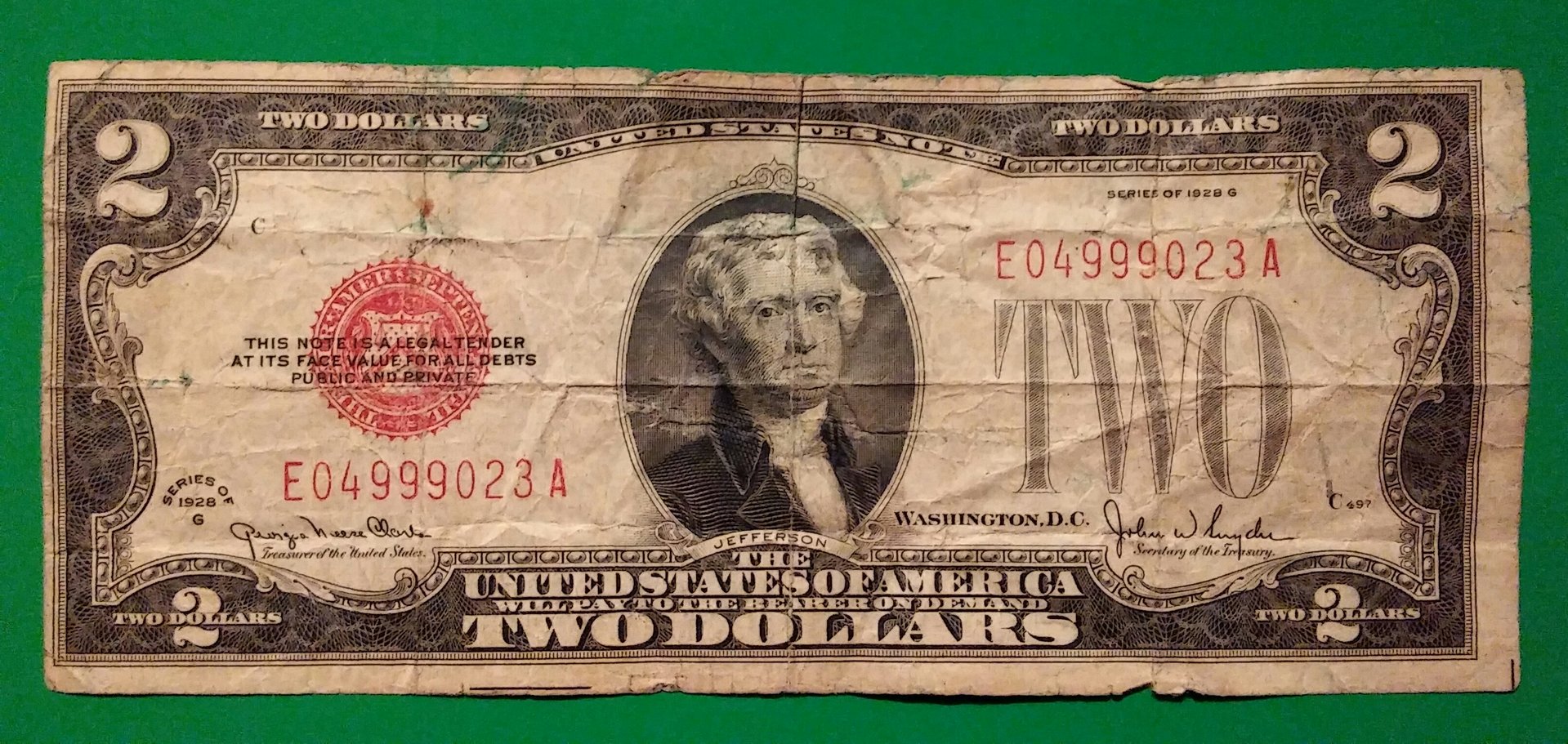 Value of 1953 Two Dollar Legal Tenders - Rare Money OldMoneyPrices.com has estimated the average value of an 1953 $2 Legal Tender banknote at $2. An uncirculated (UNC) example is worth $4.50. ( read more) Year: 1953. Type: U.S. Banknote. Denomination: 2 Dollars. Country: United States. Portrait: Thomas Jefferson. Numismatic Value: $2 to $4.50. Value: To give an estimate of this banknote in ... 1953 red seal 2 dollar bill, Missing A Corner But Still Holds Great Value. 1953 San Francisco Franklin Half Dollars, Franklin Half Dollar 1953 US Coin Errors, 1953 $2 US Federal Reserve Small Notes, Ungraded 1953 Franklin Half Dollars (1948-1963), $2 1953 US Small Silver Certificates, Uncertified Silver 1953 Franklin Half Dollars (1948-1963), Proof NGC 1953 Franklin Half Dollars (1948-1963) Two Dollar Bill Red Seal STAR NOTE Series 1953 US Currency Good or Better Each bill comes in a currency sleeve for protection. These Red Seal Two Dollar Bills will make a nice addition to any currency collection! Information on these Red Seal Series 1953 Two Dollar Bills: In 1929 all US Currency was changed to its current modern size. The $2 bill was kept only as a United States Legal Tender Note. $2 Dollar 1953=A RED SEAL OLD USA Legal Tender Note United States Paper ... $6999 Only 1 left in stock - order soon. You are ordering 1- 1953 AND I AM SHIPPING 1- $2 RED SEAL BILL. YOU ARE ORDERING 1-$2 BILL FROM 1953, Series A, B, C,or 1953 No Series. ONLY! My currency are circulated but in very good condition. They have no rips, or crease marks from having been folded over the years.