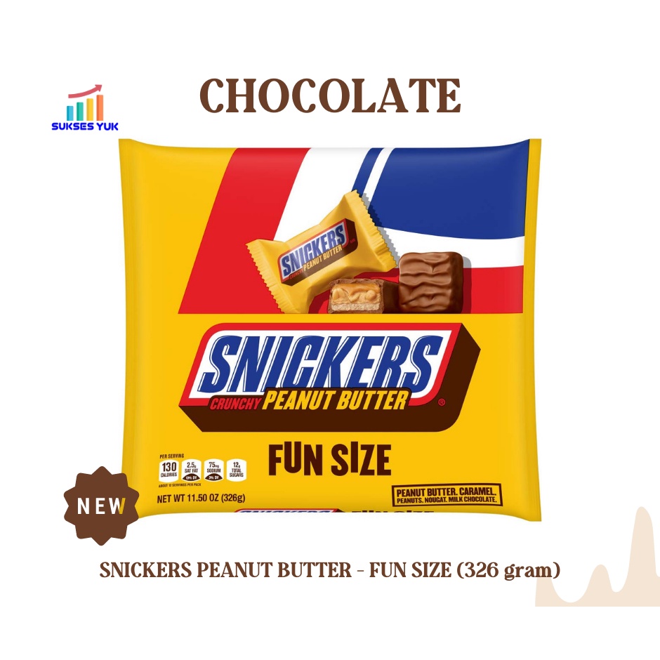 Snickers Fun Size: Calories and Nutrition Analyse Standard serving size of fun size Snickers (34 g) 162 kcal Fun size Snickers 1 bar (17g) 81 kcal Ounce (oz) of fun size Snickers 135 kcal 10g of fun size Snickers 48 kcal 20g of fun size Snickers 95 kcal 50g of fun size Snickers 238 kcal 100g of fun size Snickers 476 kcal Protein in fun size Snickers Fun size Snickers has 4.76 g protein per 100g.