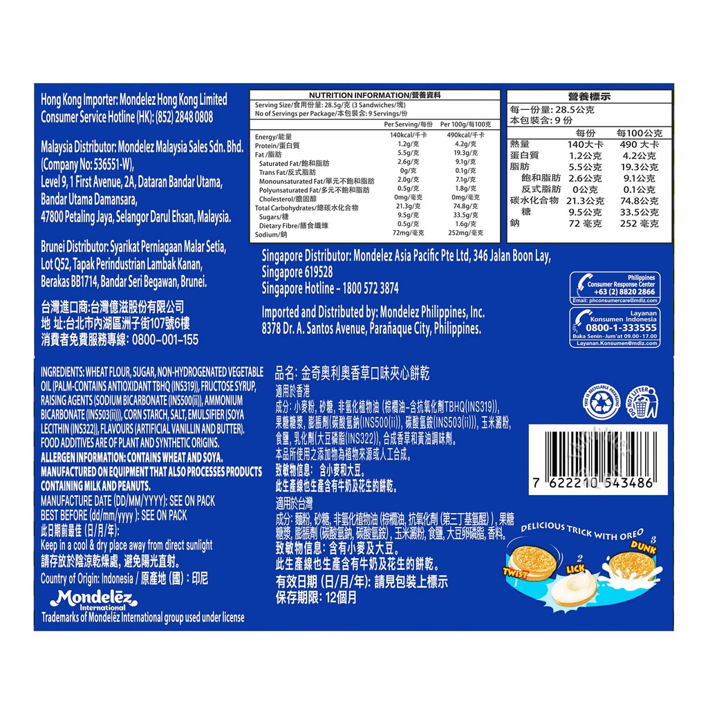 Nabisco Oreo Chocolate Sandwich Cookies Family Size Nutrition Facts Oreo Chocolate Sandwich Cookies Family Size Serving Size 3.00 cookies Serving Per Container about 16 Amount Per Serving %DV IS or Contains: Kosher,Wheat,Soy *Percentage Daily values are based on a 2,000 calorie diet.Your Daily values may be higher or lower depending on your calorie needs we recommend