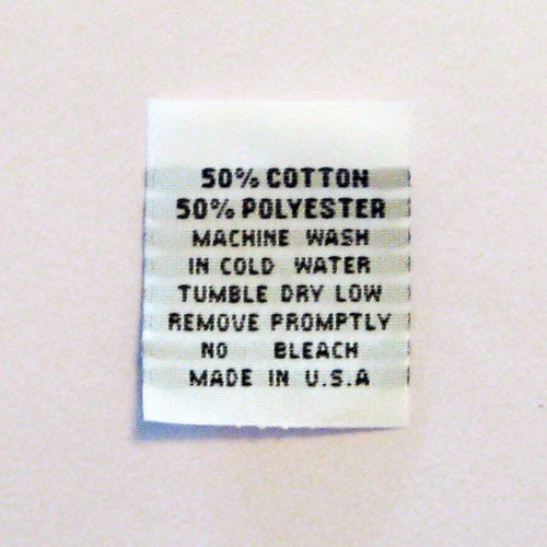 100% Cotton - Garment Care Labels - CRUZ LABEL 100% Cotton - Garment Care Labels. $15.00. Clothing care labels- High quality high density all WOVEN damask content labels with garment care instruction on backside. Front: 100% COTTON. Back: MACHINE WASH COLD / TUMBLE DRY LOW / DO NOT BLEACH / WARM IRON IF NEEDED. - Size: 30mm X 25mm (Approximately 1 3/16" x 1") folded. Choose a Background Color.