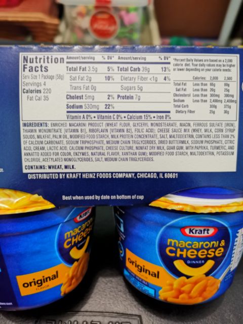 Macaroni & Cheese Cup calories, carbs & nutrition facts - MyFitnessPal Kraft Macaroni & Cheese Cup. Serving Size: 1 gram. 220 Cal. 73% 40g Carbs. 16% 4g Fat. 11% 6g Protein. Track macros, calories, and more with MyFitnessPal. Join for free! Daily Goals How does this food fit into your daily goals? Calorie Goal 1780 Cal. 220/2000Cal left. Fitness Goals: Heart Healthy. Fat 63 g. Calories in Kraft Mac & Cheese (1 cup serving) kec Here are the foods from our food nutrition database that were used for the nutrition calculations of this recipe. Calories per serving of Kraft Mac & Cheese (1 cup serving) kec 260 calories of Kraft macaroni and cheese, (70 gram) 106 calories of Smart Balance Buttery Spread (1Tbsp) kec, (1.33 tbsp) 8 calories of Milk, Fat Free, Skim, (0.67 oz) Calories in KRAFT Macaroni and Cheese Dinner Original Flavor Calories in KRAFT Macaroni and Cheese Dinner Original Flavor. Nutrition Facts. Serving Size 1 NLEA Serving (makes about 1 cup prepared) (70g) Amount Per Serving: Calories 259. Calories from Fat 23 % Daily Value* Total Fat 2.6g. 4%. Saturated Fat 1.3g. 6%. Cholesterol 9.8mg. 3%. Sodium ... Kraft Mac and Cheese Without Milk - I Try 15 Substitutes Feb 25, 2021 · I shredded 90g of parmesan cheese to replace the 1/4 cup of milk for an entire regular-sized box of Kraft mac and cheese. This is roughly 50% more cheese than the equivalent weight of milk, but hey, I love cheese.