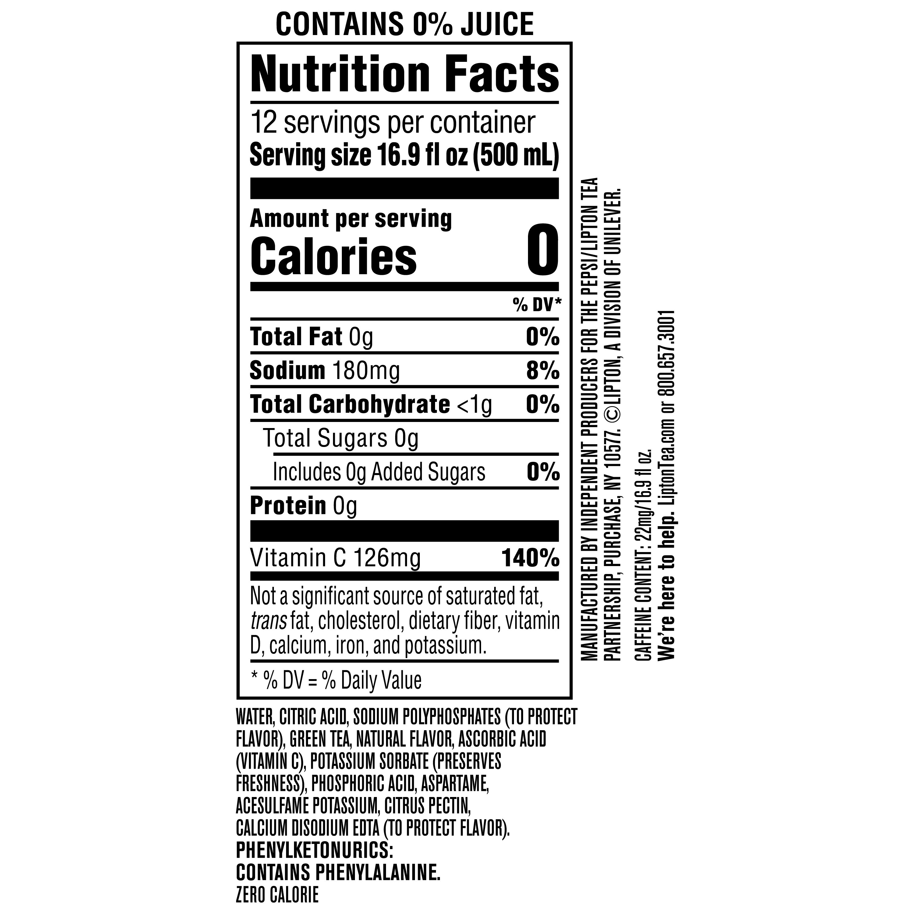Lipton Green Tea, Diet, Mixed Berry: Calories, Nutrition Analysis ... Water, Citric Acid, Sodium Polyphosphates (To Protect Flavor), Green Tea, Natural Flavor, Ascorbic Acid (Vitamin C), Potassium Sorbate (Preserves Freshness), Phosphoric Acid, Aspartame, Acesulfame Potassium, Citrus Pectin, Calcium Disodium EDTA (To Protect Flavor) Joy238 Aug 01 2013 It's so tasteful .and the best part is it has no sugar at all. Lipton Diet Green Tea With Citrus - 12pk/16.9 fl oz Bottles Lipton Diet Green Tea with Citrus blends smooth, delicious green tea with the tangy sweetness of citrus to offer you a perfectly balanced drink. This 12-pack of bottles is enough to keep your sweet tooth satisfied. The bottles are easy to carry around — whether in your house, car, lunch box or office — without having to brew it yourself. Lipton Green Tea, Mixed Berry, Diet Nutrition Facts & Calories Lipton Green Tea, Mixed Berry, Diet. LOG. View Diet Analysis Close. KEY FACTS (learn about health benefits or risks) Has low calorie density - this means that the amount of calories you are getting from an ounce is low (0 cal/oz). Rich in vitamins and minerals (3589.3%/cal) - a good source of Vitamin K and Vitamin C. ... NUTRITION FACTS (% of ... Lipton Diet Green Tea, Mixed Berry Nutrition Facts Lipton Diet Green Tea, Mixed Berry contains the following ingredients: Water, citric acid, sodium hexametaphosphate (to protect flavor), natural flavor, green tea, ascorbic acid (vitamin c), potassium sorbate (preserves freshness), phosphoric acid, aspartame, acesulfame potassium, pectin, calcium disodium edta (to protect flavor).