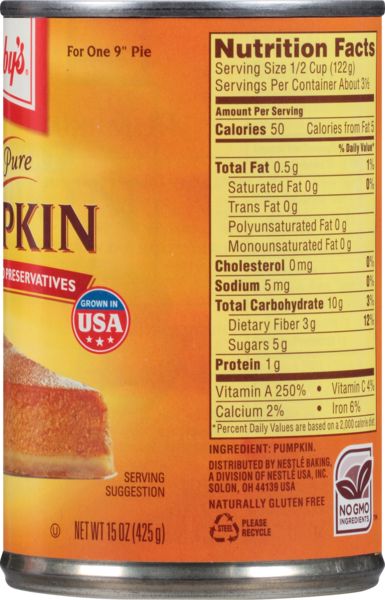 100% Pure Pumpkin Puree 15 oz | LIBBY'S® - VERY BEST BAKING Perfect in sweet or savory recipes, our 100% Pure Pumpkin is grown in the USA, ... * The % Daily Value (DV) tells you how much a nutrient in a serving of food contributes to a daily diet. 2,000 calories a day is used for general nutrition advice. Ingredients. INGREDIENTS: PUMPKIN. Allergens