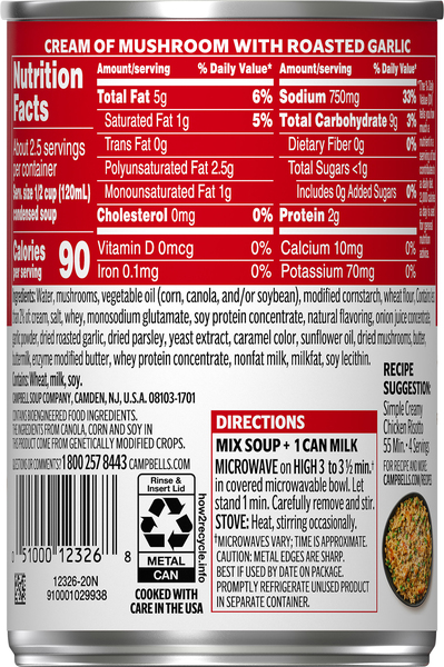 Campbell's® Classic Low Sodium Cream of Mushroom Soup Nutrition Facts ; 0g · 10mg ; 3%. Campbell's Condensed Cream of Mushroom WATER, MUSHROOMS, VEGETABLE OIL (CORN, CANOLA AND/OR SOYBEAN), CREAM, MODIFIED CORNSTARCH, WHEAT FLOUR, SALT, MODIFIED MILK INGREDIENTS, SOY PROTEIN ISOLATE, ... Cream of Mushroom Soup - Campbell Soup Company M'm! M'm! Good!® *While many factors affect heart disease, diets low in saturated fat and cholesterol may reduce the risk of this disease. **410mg sodium, 2.5g ... Campbell's Condensed Unsalted Cream of Mushroom Soup -10.5 oz. Calories :100 ; 100. Total Fat: ; Total Fat: 7g ; Cholesterol: 0mg ; 0mg. Sodium: ...
