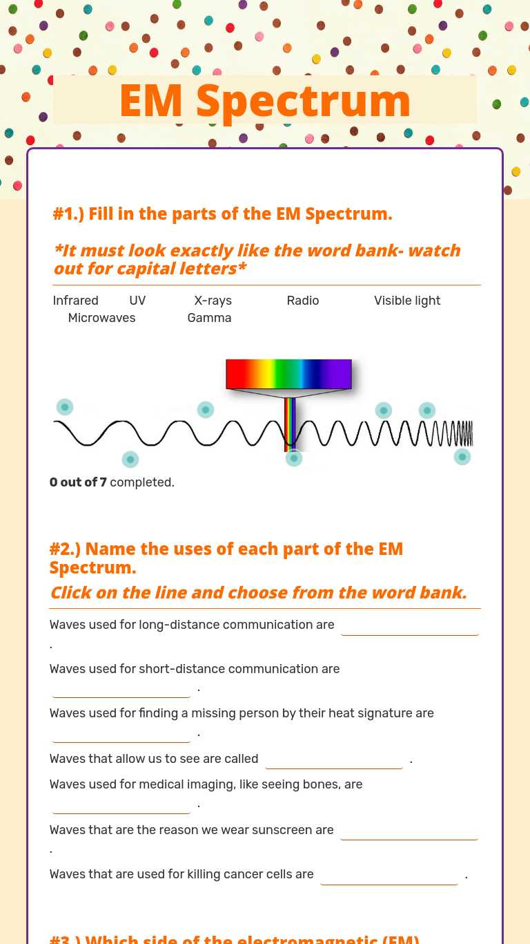 Extremely Helpful Electromagnetic Spectrum Worksheets Electromagnetic Spectrum Worksheets I have tackled all of these topics in my digital science unit on electromagnetic radiation that includes digital electromagnetic spectrum worksheets. You can see all of the pages below. The amazing thing about electromagnetic radiation is that, unlike other forms of energy, it can travel through a vacuum.