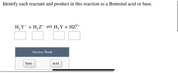7.1: Acids and Bases - Chemistry LibreTexts This definition is not wrong; it is simply limited. Acids may be compounds such as HCl or H 2 SO 4, organic acids like acetic acid () or ascorbic acid (vitamin C), or H 2 O. Anions (such as , , , and ) and cations (such as , , and ) may also act as acids. Bases fall into the same three categories. Bases may be neutral molecules (such as , , and ... Chem 106 - Sapling Questions - Topic 3 Flashcards | Quizlet Label each reactant and product in this reaction as a Brønsted acid or base. H2Y- + H2Z- <-> H3Y + H3-2 Conjugate pairs H2Y- base-acid H3Y H2Z- acid-base H3-2 conjugate acid of a base is formed by adding a proton (ion) to the base conjugate base of an acid is formed by removing a proton from the acid. Chem 1412 Hw 10 Flashcards | Quizlet Consider three generic acids with the following relative strengths: HX > HY > HZ Rank the strengths of their conjugate bases. Strongest Base Z- Y- X- Weakest Base 6. Complete these Bronsted-Lowry reactions. HS^- + H^+ = H2S HS^- + OH^- = HO+S^2- 7. Rank the oxoacids of Iodine according to strength. Strongest Acid HIO4 HIO3 HIO2 HIO 8. Solved Identify each reactant and product in this reaction - Chegg Identify each reactant and product in this reaction as a Brønsted acid or base. H2Y−+H2Z−↽−−⇀H3Y+HZ2−H2Y−+H2Z−↽−−⇀H3Y+HZ2− Expert Answer 100% (7 ratings) 1st step All steps Final answer Step 1/2 bronsted acid donates H + and bronsted base accepts H + View the full answer Step 2/2 Final answer Previous question Next question